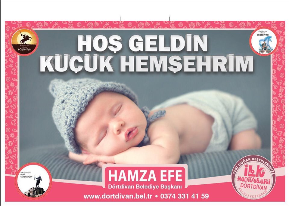 Belediyemizin “Hoşgeldin Küçük Hemşehrim” projesi kapsamında Başkanımız Hamza EFE yeni doğan bebeklerin evlerini eşi ile birlikte ziyaret ederek, gözünüz aydın temennisiyle hediye paketini takdim ediyor. Dörtdivan’da dünyaya gelen bebeklerin; “Zıbın, Battaniye, Taşıma Çantası, Biberon, Islak Mendil, Önlük, Bebek Kıyafeti” olan hediye paketi belediyemiz tarafından ailelere ulaştırılıyor.