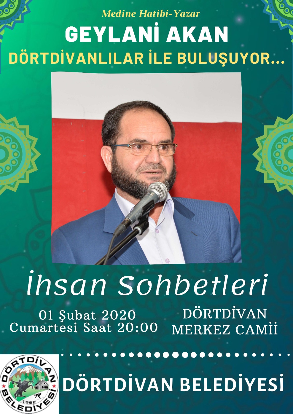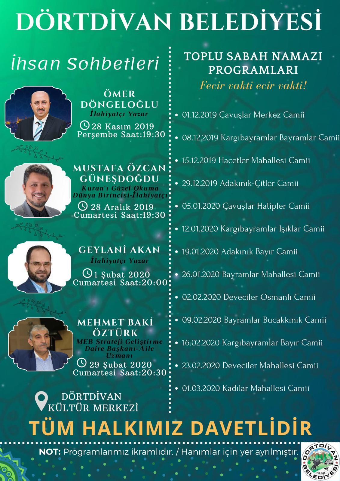 Belediyemizin düzenlediği ihsan sohbetleri üçüncü programı 1 Şubat Cumartesi akşamı Çavuşlar Merkez Camiinde yatsı namazından sonra Medine hatibi ve yazar Geylani Akan ile yapılacaktır. Bütün halkımız davetlidir. Hanımefendiler için yer ayrılmıştır. Program sonrası vatandaşlarımıza ikramımız olacaktır.