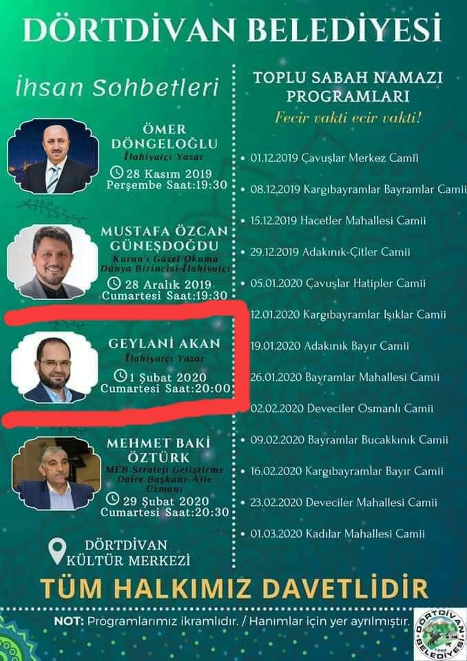 Medine Hatibi ve Yazar Sn. Geylani AKAN, Dörtdivan Merkez Camisinde saat 20:00’da ilçemiz vatandaşlarıyla buluştu. Belediye Başkanımız Hamza Efe’ nin konuşmasıyla başlayan program Sn. Akan hocamızın sohbeti ile devam etti. Bir sonraki İhsan sohbeti programı 29 Şubat 2020 MEB Strateji Geliştirme Daire Başkanı – Aile Uzmanı Mehmet Baki ÖZTÜRK ile gerçekleştirilecektir.