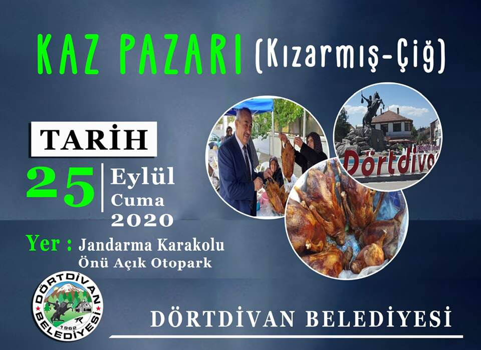 Geleneksel Dörtdivan Hayvan ve Emtia Panayırı bu sene pandemi nedeniyle gerçekleştirilemeyecektir. Fakat vatandaşlarımızı 25 Eylül Cuma günü kurulacak olan kaz pazarımıza davet ediyoruz.