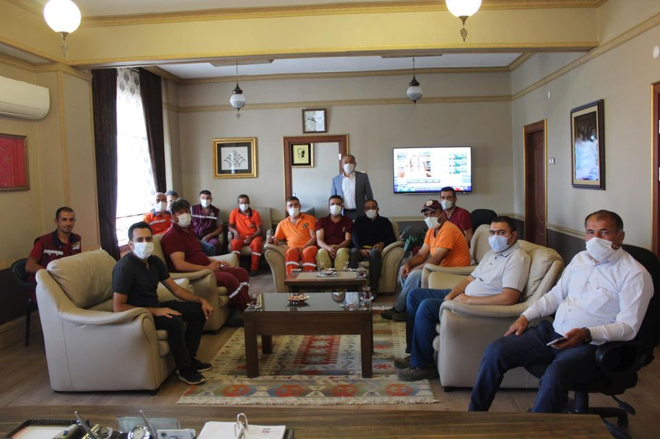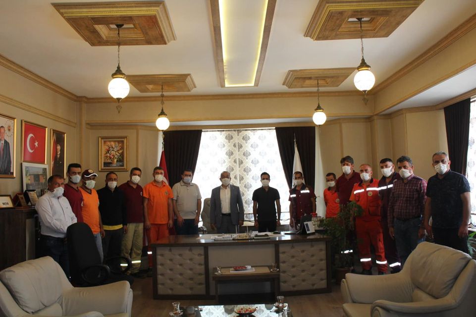 İlçemizde yaşanan üzücü Orman yangını nedeni ile çevre illerden gelip özverili bir şekilde yangını söndürmeye çalışan yangın söndürme ekiplerini Belediye Başkanımız Hamza EFE makamında misafir etti.