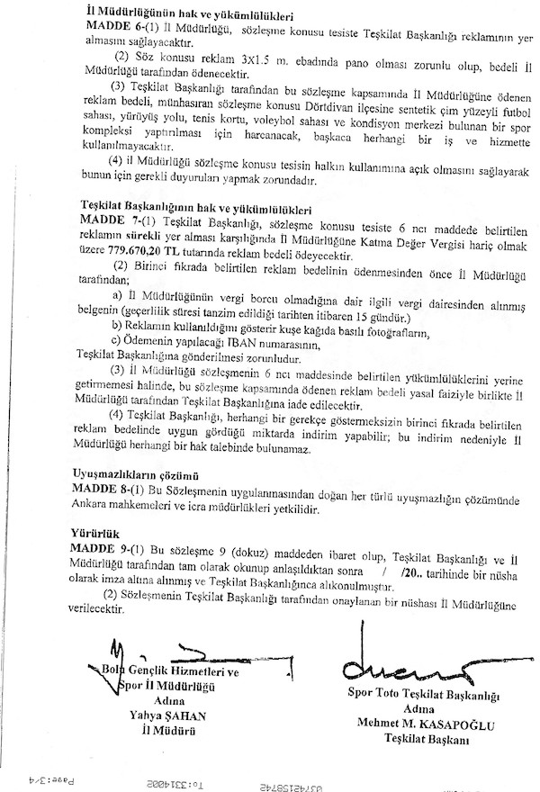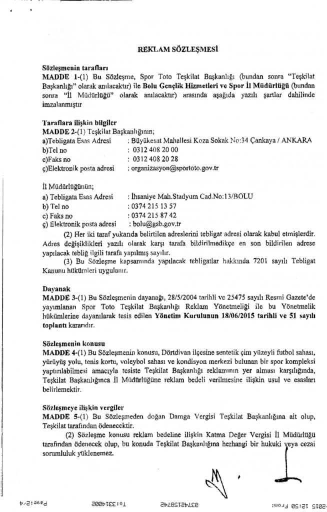 Spor Toto Teşkilat Başkanlığı Yönetim Kurulunun 18.06.2015 tarih ve 51 nolu toplantısında almış olduğu karar gereğince Bolu Gençlik Hizmetleri ve Spor İl Müdürlüğüne Dörtdivan İlçesine sentetik çim yüzeyli futbol sahası, yürüyüş yolu, tenis kortu, voleybol sahası ve Kondisyon Merkezi bulunan bir Spor Kompleksi yapılabilmesi amacıyla tesiste Teşkilat Reklamının sürekli yer alması karşılığı KDV Hariç 779.670.20 TL ödenmesi uygun görüldü. Spor Toto Teşkilat Başkanlığından ödenecek, bu paranın tahsis edildiği ve başka bir amaçla kullanılamayacağı 18.06.2015 tarih ve 1917 sayılı yazı ile bildirildi.
