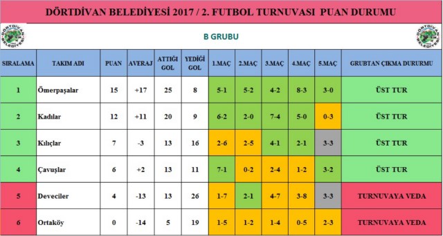 2017 Dörtdivan Belediyesi Futbol Turnuvası’nda grup maçları tamamlandı ve Son 16 Turu'na çıkan takımlar belli oldu. 24 takımın 6’şarlı 4 grupta, 28 Haziran 2017 - 06 Ağustos 2017 tarihleri arasında oynadığı karşılaşmalar sonunda gruplarında ilk dört sırada yer alan takımlar Son 16 Turu'na çıkmaya hak kazandı.