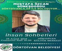 Belediyemizin düzenlediği ihsan sohbetleri ikinci programı 28 Aralık cumartesi akşam saat 19:30 da Mustafa Özcan Güneşdoğdu ile yapılacaktır.