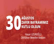 BELEDİYE BAŞKANIMIZ HASAN UZUNOĞLU, 30 AĞUSTOS ZAFER BAYRAMI DOLAYISIYLA BİR KUTLAMA MESAJI YAYINLADI. Uzunoğlu mesajında “30 Ağustos