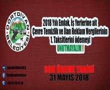 2018 YILI EMLAK VE ÇEVRE TEMİZLİK VERGİSİNDE SON GÜN 31 MAYIS 2018 yılı Emlak, İş yerlerine ait Çevre Temizlik ve İlan Reklam Vergilerinin 1